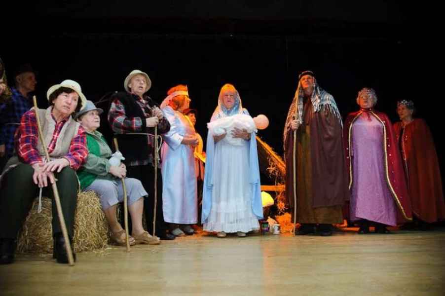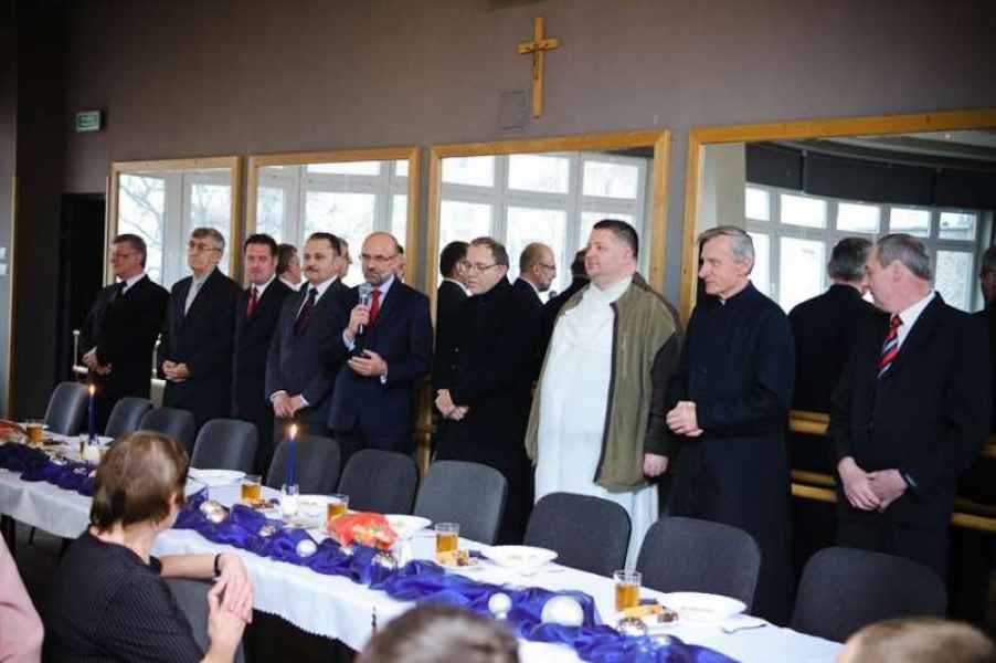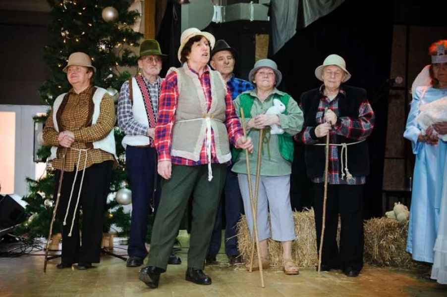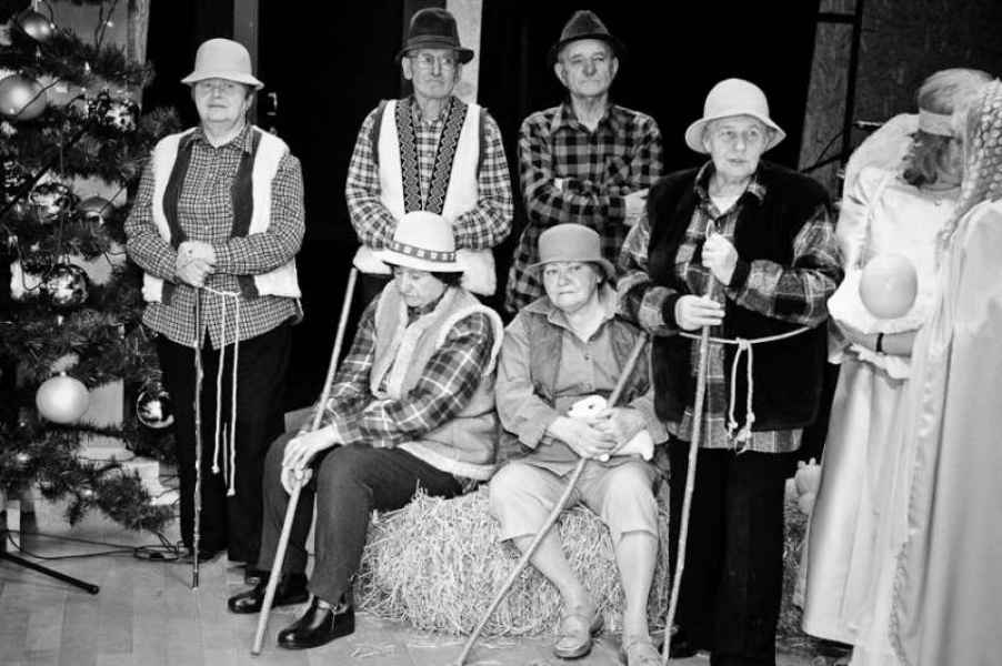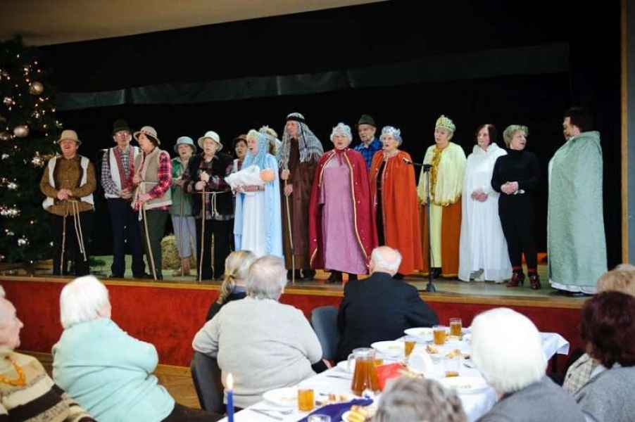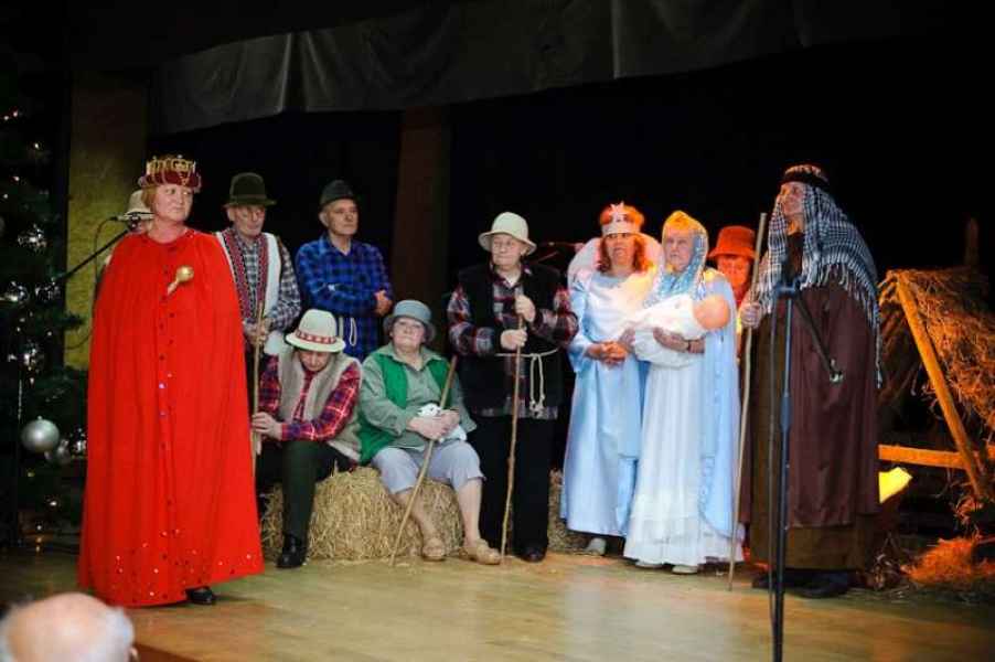 Po modlitwie zebrani dzieląc się opłatkiem złożyli sobie najszczersze życzenia a na senie pojawił sie zespół teatralno-wokalny z Klubu Seniora prezentując przedstawienie jasełkowe po którym wszyscy zasiedli do wspólnego posiłku.
