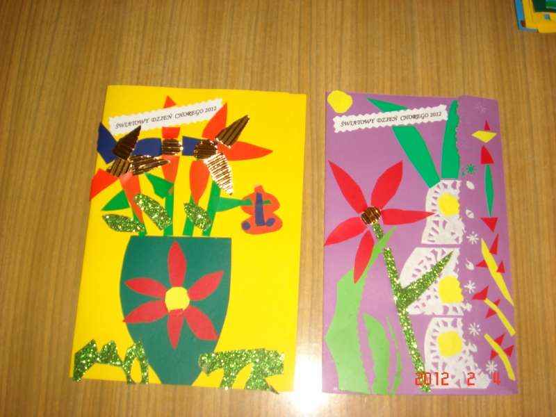 W pierwszym tygodniu wykonywaliśmy laurki z życzeniami dla pacjentów miejscowych szpitali. W technice wycinanki z folii samoprzylepnych powstały piękne kartki, które zostały wręczone 10 i 11 lutego z okazji Światowego Dnia Chorego. Autorzy prac zostali nagrodzeni.