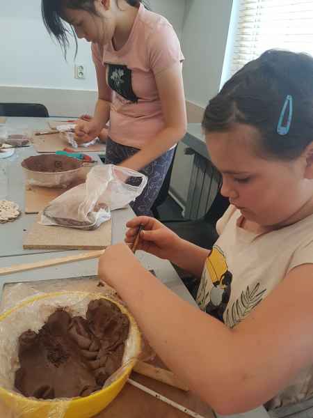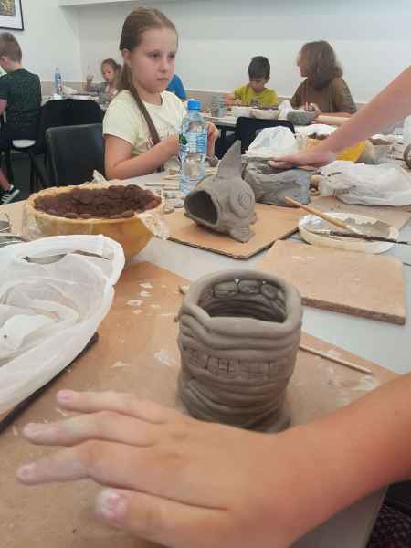 Prace uczestników wykonane w większych rozmiarach zostaną wypalone po całkowitym wyschnięciu. W ostatnim dniu warsztatów, dzieci malowały farbami akrylowymi różne formy rękodzieła już wypalonego. Dzieci zabrały prace do domu, które będą wspaniałym upominkiem na „specjalną okazję” Na zakończenie każdy uczestnik otrzymał słodki upominek. Wypalone prace będzie można zobaczyć we wrześniu w naszej Galerii „Na Piętrze”.